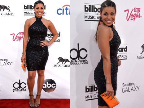 Az énekesnőn rendkívüli jókedvvel lépdelt végig a vörös szőnyegen ebben a csillogó, fekete Michael Costello-miniben, amihez narancssárga retikült, Stuart Weitzman-szandált és Neil Lane-ékszereket párosított.