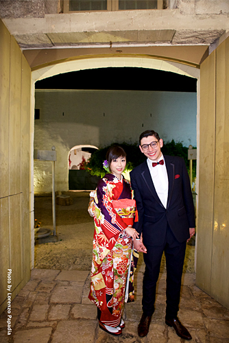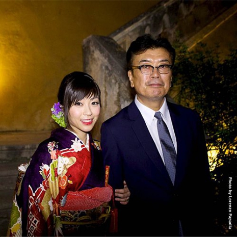 Hikki helyi idő szerint 12:20-kor érkezett meg, majd őt követte Calliano. Az eseményre tilos volt a fotósoknak bemenni, s mikor a pár megérkezett és mikor távozott, akkor is tradicionális japán esernyőkkel takarták el őket a kamerák elől, és több testőr tartotta távol a paparazzikat, riportereket.