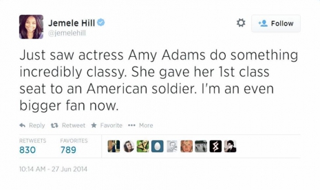 „Épp most láttam Amy Adams színésznőt valami hihetetlen klassz dolgot tenni. Átadta az első osztályra szóló ülőhelyét egy amerikai katonának. Egyre nagyobb rajongója vagyok” – csiripelte a Twitteren a műsorvezető még aznap.