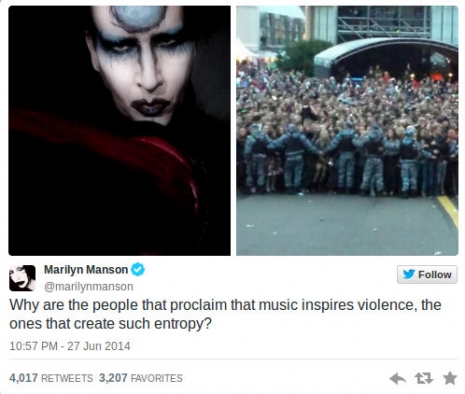 „Miért hirdetik azt az emberek, hogy a zene inspirálja az erőszakot, azt, ami oly sok entrópiát eredményez?” – írta Manson elkeseredetten a Twitteren egy képet mellékelve az ellene tüntető tömegről.