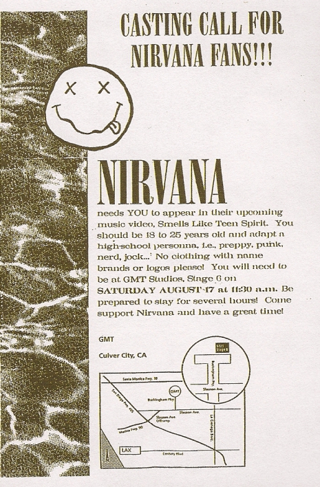 A Nirvanának szüksége van rád, hogy feltűnj a hamarosan készülő Smells Like Teen Spirit videoklipben. Legyél 18 és 25 év közötti és alkalmazkodj a középiskolás megjelenéshez pl.: laza, punk, fura, sportos. Légy szíves, ne öltözz zenekarnevekkel vagy logókkal ellátott ruhába. Legyél a GMT Stúdió hatos színpadánál augusztus 17-én (szombaton) délelőtt fél 12-kor. Úgy készülj, hogy maradni tudj néhány órán át! Gyere, támogasd a Nirvanát és mulass jól!”