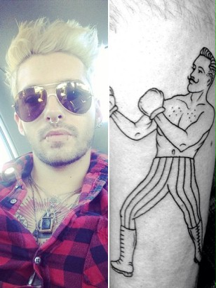 Az ilyen egyszerű tetoválások mostanában nagyon divatosak és most Bill is behódolt ennek a hóbortnak. A Tokio Hotel énekesének alkarján elhelyezkedő bokszoló csíkos nadrágot és bajuszt visel, kicsit kopaszodik, és a mellkasán pontok vannak.