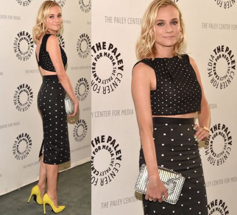 Diane Kruger a The Bridge június 24-i, Beverly Hills-i premiervetítésére egy kétrészes Roland Mouret-kreációt húzott fel, mely fekete színű és fehér pöttyökkel tarkított és a 2015-ös kollekcióban kapott helyet. Fekete-fehér retiküljét Pierre Hardytól kölcsönözte, figyelemfelkeltő, sárga magassarkúját pedig Stuart Weitzmannak köszönheti.