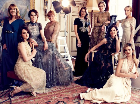Balról jobbra: Phyllis Logan (Mrs. Hughes), Sophie McShera (Daisy), Michelle Dockery (Lady Mary), Lesley Nicol (Mrs. Patmore), Raquel Cassidy (Mrs. Baxter), Laura Carmichael (Lady Edith), Elizabeth McGovern (Lady Grantham), Joanne Froggatt (Anna) és Lily James (Lady Rose)