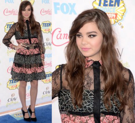 A 18 éves színésznő egy fekete-rózsaszín, csipkés Elie Saab-ruhába bújt, mely a 2014-es kollekcióból származik. Bár egész megjelenésében tökéletes a színharmónia, nem éppen egy ilyen szerelésben képzeltük volna el Hailee-t, ugyanis jó pár évvel öregíti. Magassarkúja a Casadeitől származik, ékszereit pedig a Vita Fede, a Graziela Gems és az EFFY biztosította.