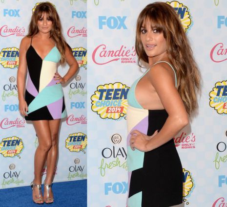 A Glee sztárja sem az egyszerűségre törekedett, amit ez a 2014-es őszi Fausto Puglisi-mini is bizonyít, melyen négy szín oszlik el aszimetrikusan. Ezüstszínben pompázó cipőjét Christian Louboutin tervezte és ezúttal mellőzte az ékszereket, hogy a hangsúly egyértelműen a ruhán legyen.