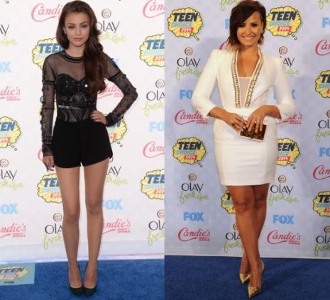 A brit énekesnővel ellentétben Demi viszont angyali oldalát mutatta meg a kék szőnyegen, ugyanis egy nőies és elegáns, elefántcsontszínű Elisabetta Franchi-ruhát viselt, mely a 2014-es őszi kollekcióból származik.
