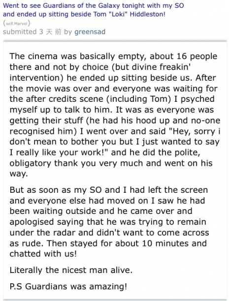 Néhány szerencsés rajongónak megadathatott, hogy a mindenki által kedvelt Loki mellett nézhette meg a Galaxis őrzőit egy brit moziban. A film vége után egy rajongó oda is merészkedett hozzá, hogy elmondhassa neki, mennyire is nagyszerű ember – mire a színész lerázta őt.