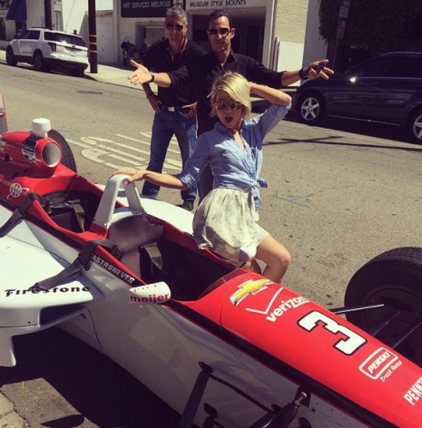 Julianne a Forma-1 versenyzőkkel lógott együtt, és bár kocsit nem vezetett, egy élménnyel biztos gazdagodott. A kép is tükrözi, hogy remek időt töltöttek együtt.