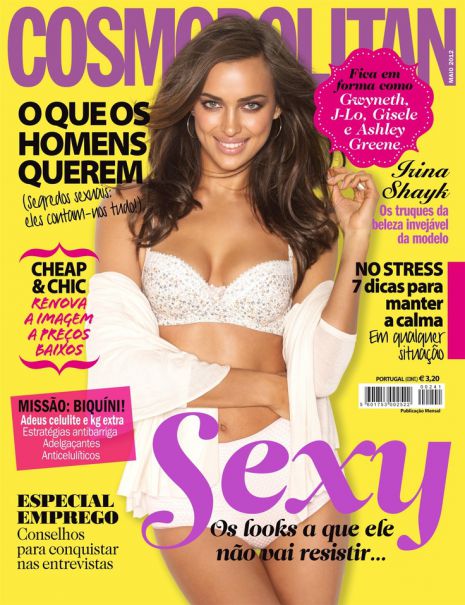 Ismét egy tökéletes Cosmopolitan-címlap, mely nagyon jól mutatja, hogy mi is a nagy különbség a divatmodellek 80%-a és az Irina-féle manökenek között. Nem csak az, hogy Irina alakja sokkal formásabb, hanem az is, hogy mosolyog! Hatalmas plusz pont, ráadásul a fehérnemű is tökéletesen áll rajta.