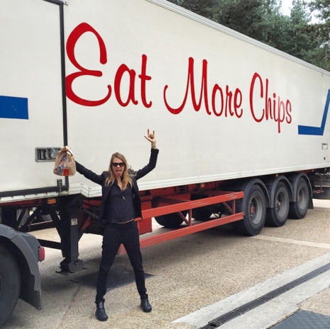 Nagyon úgy fest, hogy a modell megelégelte a kötött diétáját és a salátákat, hiszen Instagram-oldalán fellázadt. Cara egy „egyél több chipset” feliratú traktor mellett pózolt egy jó adag mekis kaja kíséretében.