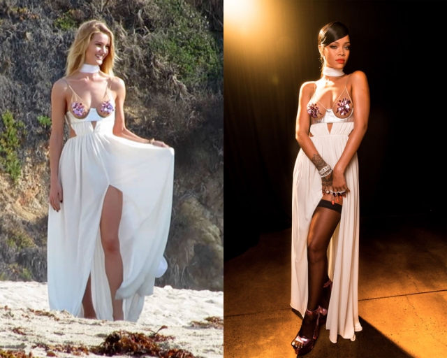 A szőkeséget és a barbadosi énekesnőt is Tom Ford kirívó ruhájában kapták lencsevégre, ám míg Rosie a tengerparton, Rihanna az amFAR Glam gálán viselte a lenge darabot. Az öltözék egyikükön sem festett előnyösen, de Rihannának több mínusz pont jár, mivel egy hivatalos eseményen viselte, ráadásul fekete combharisnyával.