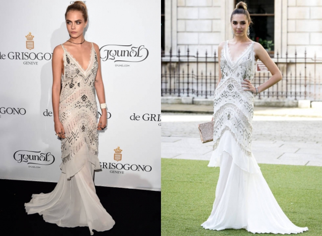 Cara és Amber is Roberto Cavalli maxiruhája mellett voksolt, mely mindkettejüknek remekül állt, de mi mégis Amberre szavazunk, mivel ékszerei csak még előkelőbbé teszik öltözékét, – nem úgy Delevigne fekete, bőrlánca – és a fényviszonyok is neki kedveznek, hiszen természetes fényben előnyösebb a gyöngyökkel kirakott ruha.