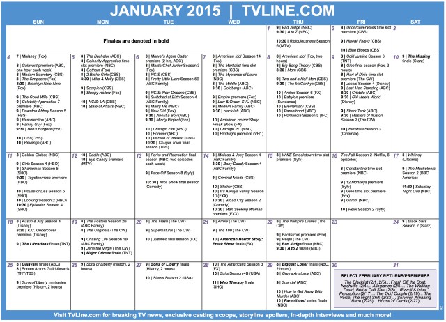 A TVLine mindenkire gondolt, mikor nagy örömünkre elkészítette a naptárat, melyben összegyűjtötte, melyik sorozat, mikor kerül újra műsorra. Van azonban néhány sorozat, amely nem szerepel a képen, mivel ezeket sajnos csak márciusban láthatjuk majd újra. Az Egyszer volt, hol nem volt 2015. március 1-jén tér vissza a 4. évad 13. részével, amely a Darkness on the Edge of Town címet viseli, a Fox újdonsága, Az utolsó ember a Földön (The Last Man on Earth) szintén aznap debütál majd, a Gyilkos hajsza március 2-án érkezik a 3. évaddal, a S.H.I.L.D. ügynökeit pedig március 3-án láthatjuk újra.