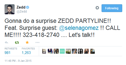 Az énekesnő nem olyan rég átment a Hollywood Recordstól az Intrescope-hoz, és a tegnapi nap folyamán a Twitteren közölték, hogy Zedd-del közösen több rajongóit is felhívnak, valamint a fanok is hívhatták őket és beszélgethettek velük.