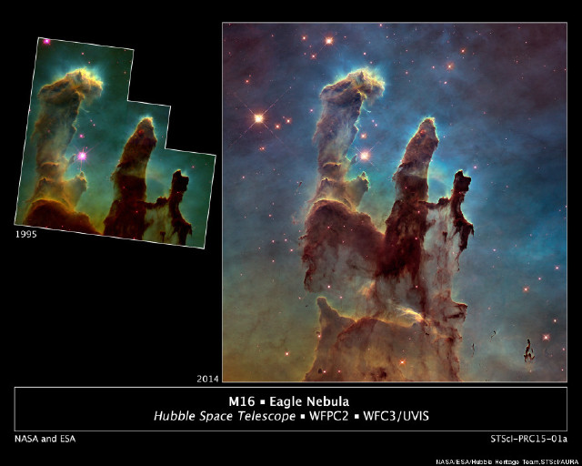 A Hubble ugyanis HD-ben megörökítette a Teremtés Oszlopai nevet viselő, hideg hidrogén gázból és porból felhőket a körülbelül kétmillió éves Messier 16-ban, vagy más néven a Sas-ködben, ami a Kígyó csillagképben található meg, hozzávetőlegesen 6500 fényévnyire a Földtől.