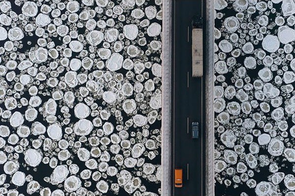 25. Egy aprócskának tűnő híd egy nagy folyó felett, melyben hatalmas jégdarabok úszkálnak.