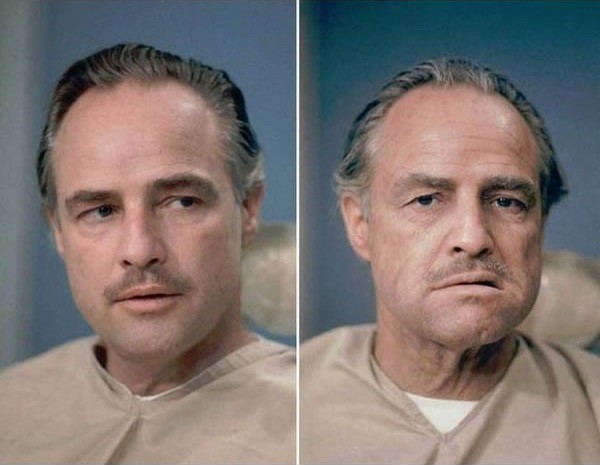36. Íme egy fotó a 2004-ben elhunyt Marlon Brandóról mielőtt elkészült volna A keresztapa-beli sminkje és egy másik kép, melyen már Don Corleoneként köszön vissza ránk.