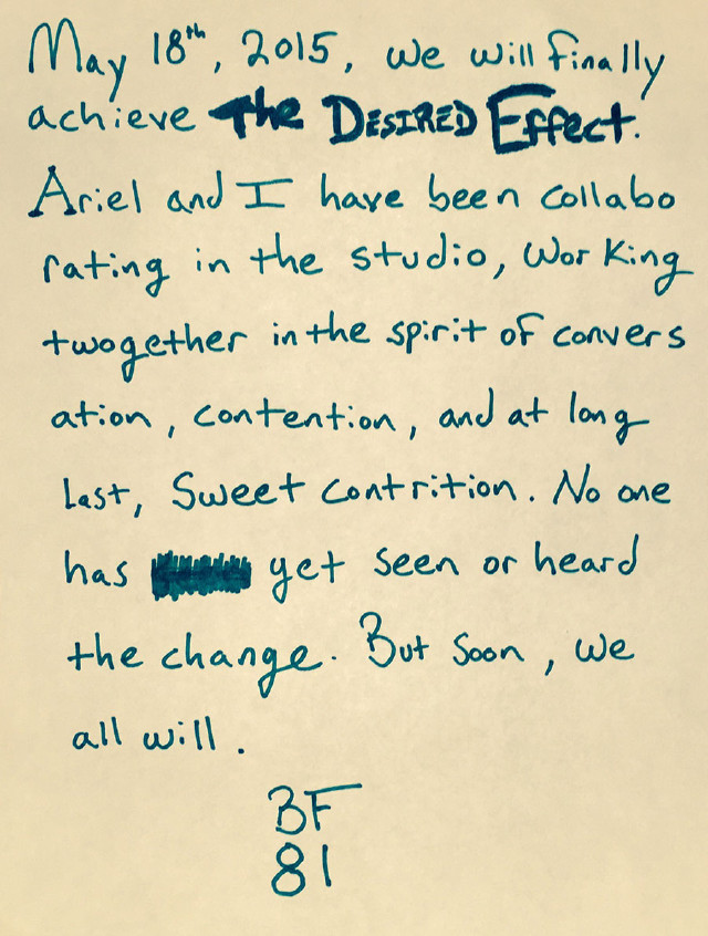 2015. május 18-án végre fizikai testet ölt a The Desired Effect. Ariel és én együttműködtünk a stúdióban, dolgoztunk a kommunikáció, a vita, s végül az édes bűnbánat szellemében. Még senki sem látta vagy hallotta a változást. De hamarosan mindannyian fogjuk. BF 81