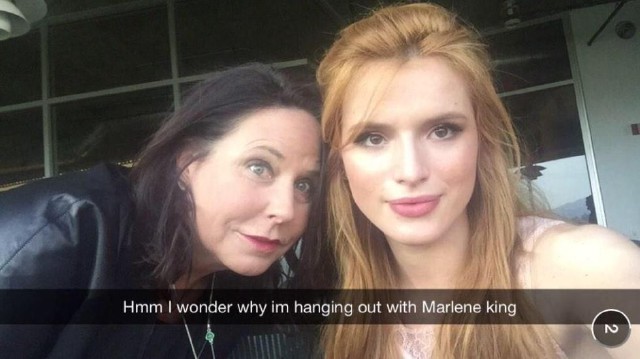 Pár napja a Disney egykori csillaga, Bella Thorne posztolt egy képet a Snapchaten keresztül, melyen a Pretty Little Liars forgatókönyvírójával, Marlene Kinggel látható, a fotóhoz pedig ezt írta: Hmm, vajon miért lógok együtt Marlene Kinggel?