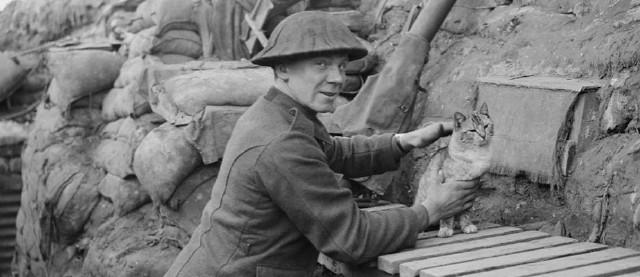 A York és Lancaster Ezred egyik lövésze pózol a szintén az ezred állományába tartozó macskával egy árokban, közel a franciaországi Cambrinhez 1918. február 6-án.