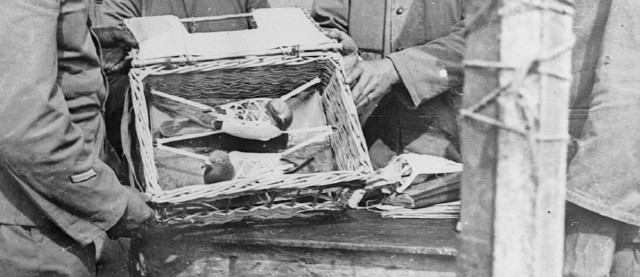 Francia csapatok két, utazókosárba szíjazott postagalambbal.