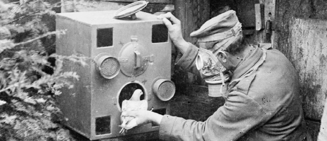 A német katona légzésvédő maszkot visel, miközben a postagalambot behelyezi egy gázbiztos kamrába. A fotó feltehetően egy antigázgyakorlat során készült.