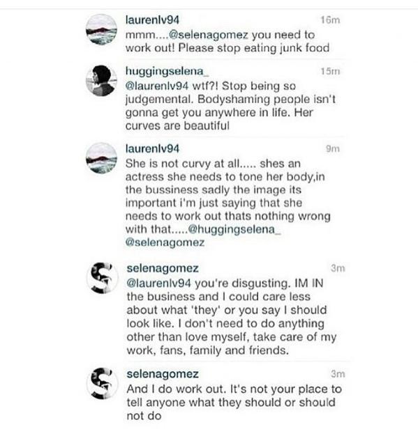 Ekkor viszont már maga Selena is beszállt az összeszólalkozásba: Undorító vagy. Én vagyok az, aki részese ennek az iparágnak és még ennyit sem kellene foglalkoznom azzal, hogy mit mondanak ’ők’ vagy akár te arról, hogy hogyan kellene kinéznem. Nincs más dolgom, mint hogy szeressem magamat, végezzem a munkámat, figyeljek a rajongóimra, a családomra és a barátaimra. Egyébként pedig edzek. Nem a te dolgod, hogy megmondd bárkinek is, hogy mit kellene csinálnia vagy mit nem.