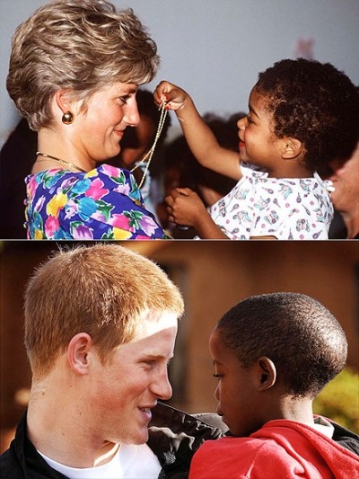 Diana hercegnő 1991-ben São Pauloban, Brazíliában járt egy HIV-pozitív és elhagyott gyermekek számára nyílt otthonban. Harry a dél-afrikai Lesothóban található Mants'ase gyermekotthonba látogatott el, ahol a kép készültekor a hatéves árva Mutsu Potsanével beszélgetett.