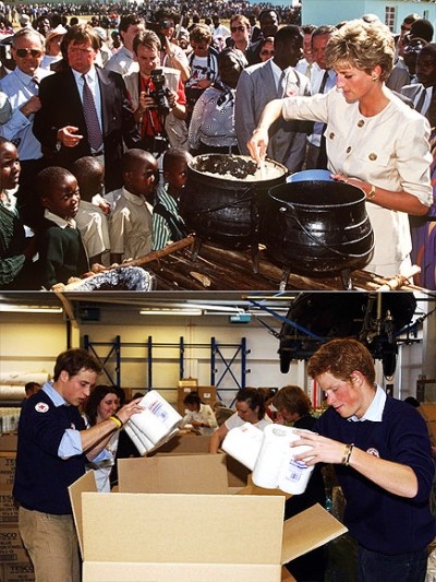 Diana hercegnő 1993-ban négynapos látogatást tett Zimbabwéban, melynek során élelmet vitt a Nemazura központba, amely a menekültek ellátását biztosította. William és Harry a Vöröskereszt bristoli lerakatában segédkezett segélycsomagok elkészítésében, amelyet a Maldív-szigeteket sújtott szökőár áldozatainak szántak.