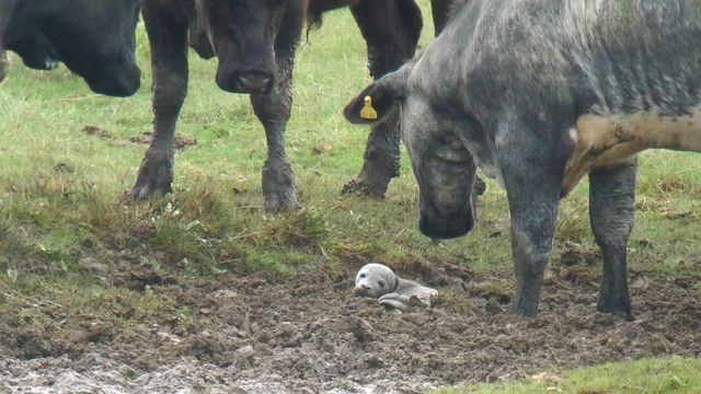 Egy lincolnshire-i réten talált rá egy csapat kíváncsi tehén egy ötnapos fókára, aki beleragadt a sárba.