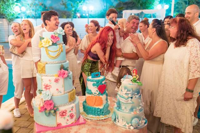 A buli természetesen vízközelben zajlott, és a díszlet is tükrözte a hableányok világát. A szebbnél szebb kagylók mellett maga a születésnapi torta volt a legszebb díszítés. Sőt, nem is egyet kapott az énekesnő: az egyiken világoskék cukormáz volt, amelyet marcipánrózsák és fehér alapon virágminták díszítettek; a másik fehér és sötétebb árnyalatú kék borítást kapott néhol pikkelyeket ábrázolva, míg a tetején 30-as szám jelezte a sztár korát; a harmadik sütemény tetején pedig a kis hableány, vagyis Ariel látható marcipánból készítve, maga a torta pedig szintén fehér és kék színvilágot kapott.