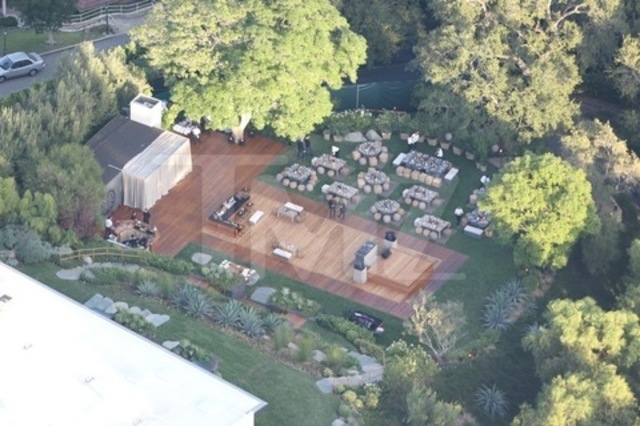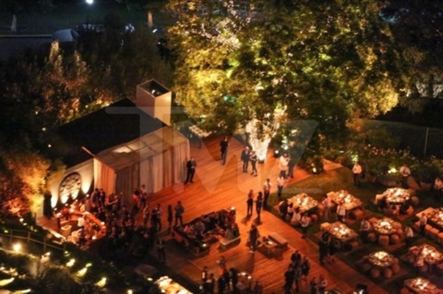 A hatalmas udvar dugig volt asztalokkal, székekkel, egy hatalmas táncparkettel és természetesen vendégekkel, valamint felszolgálókkal, továbbá sikerült lekapniuk a lesifotósoknak egy lelkészt és egy hatalmas tortát is, melyen az ifjú párról mintázott bábok csücsültek.