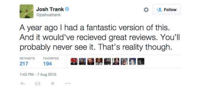 A rendező, Josh Trank egy azóta törölt tweetben tárta szét karjait: Egy évvel ezelőtt egy fantasztikus változatom volt ebből. És remek kritikákat kapott volna. Talán sosem fogjátok látni. De ez a valóság.