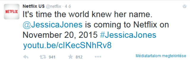 Csütörtökön a Marvel és a Netflix bejelentette a Twitteren, hogy november 20-ától lesz elérhető a websorozat a rajongók számára: Itt az ideje, hogy a világ megismerje a nevét. 2015. november 20-án jön Jessica Jones a Netflixre.