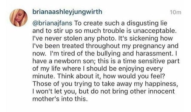 Ilyen gusztustalan hazugságot kreálni, és ennyi bajt okozni vele egyenesen elfogadhatatlan. Sosem loptam egyetlen fényképet sem. Bele vagyok betegedve abba, ahogyan bánnak velem most és a terhességem ideje alatt. Belefáradtam a terrorba és a zaklatásba. Van egy újszülött kisfiam; ez életem legérzelmesebb időszaka, aminek minden pillanatát élveznem kellene. Gondoljatok csak bele, ti hogyan éreznétek a helyemben? Megpróbálják ellopni a boldogságom, de nem hagyom, hogy így legyen, és más ártatlan anyákat is belerángassanak ebbe
