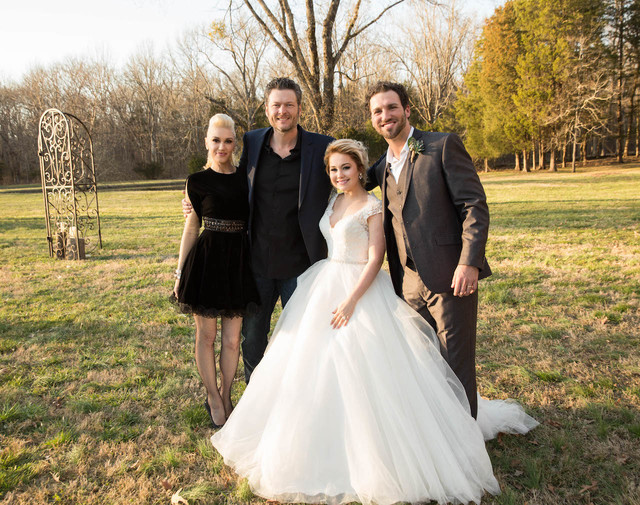 Az esküvőt követően természetesen egy jó hangulatú fogadás várta a vendégeket, ahová Blake Shelton is meghívást kapott, aki korábban a The Voice című tehetségkutató műsorban mentorálta a szőkeséget. A countrysztár természetesen nem hagyta otthon új barátnőjét, Gwen Stefanit sem, aki ezúttal is kiváló ízléséről tett tanúbizonyságot combközépig érő koktélruhájában.