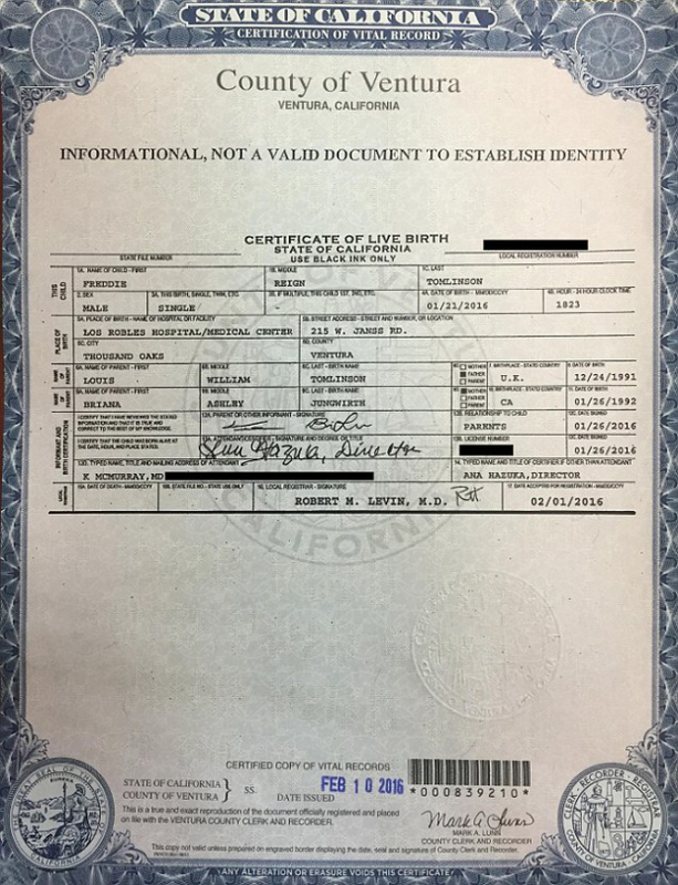 Tegnap azonban fordult a kocka, ugyanis nyilvánosságra került a kis Freddie születési anyakönyvi kivonata, melyből kiderül, hogy a kicsi január 21-én született Los Angelesben Briana Ashley Jungwirth és Louis William Tomlinson gyermekeként, és a Freddie Reign Tomlinson nevet kapta szüleitől. Az iratot az anya és az apa is ellátta kézjegyével.