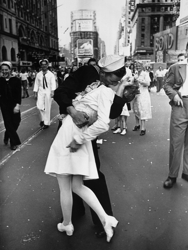 Egy tengerész megcsókol egy ápolónőt a New York-i Times Square-en, amikor megtudja, hogy véget ért a második világháboú (1945)