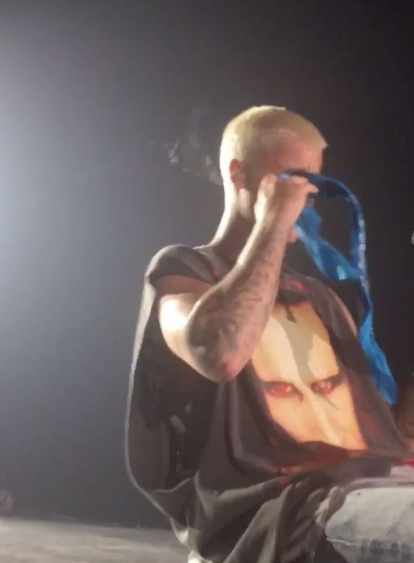 Vasárnapi fellépésén Justin Biebert is magával ragadták az érzelmek: legutóbbi lemeze címadó dalának előadása közben a földön feküdt, majd egy kendővel törölgetni kezdte a szemét, hogy elrejtse kitörni készülő könnyeit.