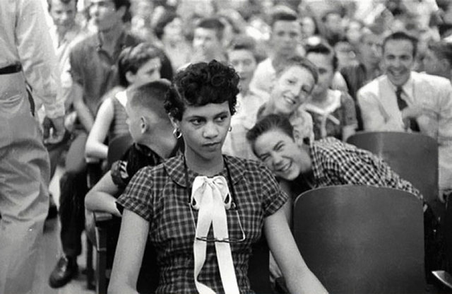 Mint tudjuk, a feketék csak másodosztályú lakosai voltak az USA-nak, még a rabszolgafelszabadítás után is. Ez azt jelentette, hogy nem volt joguk szavazni, és a közéletben is egy külön helyet kaptak: volt a feketék számára fenntartott templom, szórakozóhely és iskola is. A képen láthatjuk, a fiú osztálytársai milyen megalázásnak tették ki a lányt, aki megkívánta szegni a diszkrimináció szabályait.
