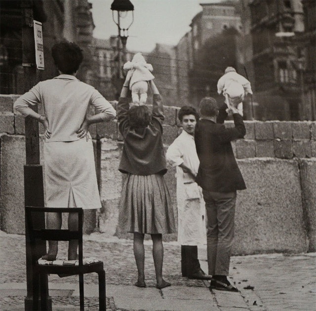 12. A nyugati oldalon élő berlini szülők mutatják az újszülött gyermekeiket a keleti oldalon élő nagyszülőknek – 1961