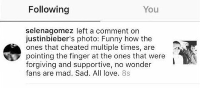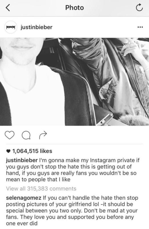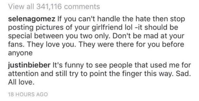 Selena kommentjére Justin is válaszolt, és ezzel elindult egy kisebb vita az egykori szerelmesek között. Míg az énekes azzal vádolta korábbi barátnőjét, hogy rajta keresztül akart figyelemhez jutni, addig a másik beismerte, hogy Bieber többször is megcsalta őt. A kommentháborúnak végül Selena vetett véget.