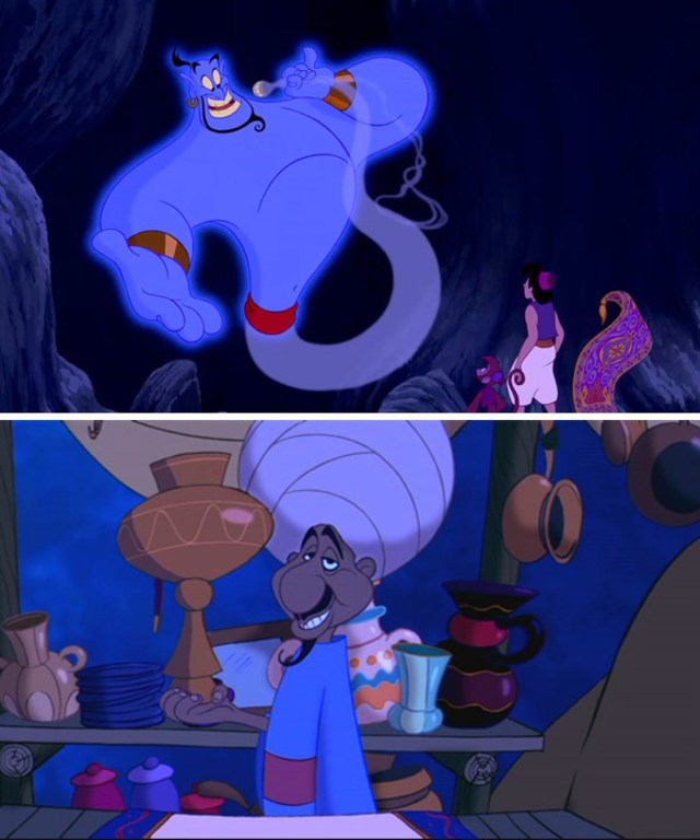 Emlékeztek még a film elején szereplő árusra, aki üdvözli a nézőket és elmeséli a történetet? Ugyebár nála van Dzsini lámpája, de nemcsak ez az alapja a teóriának. A küllemükben sok hasonlóságot fedezhetünk fel, ugyanaz a kék ruha egy piros övvel átkötve, bozontos szemöldök, valamint a nevetséges szakáll, ami a végén kunkorodik. Ha ez még nem lenne elég ahhoz, hogy gyanakodjunk, mindkét szereplőnek Robin Williams kölcsönzi a hangját.