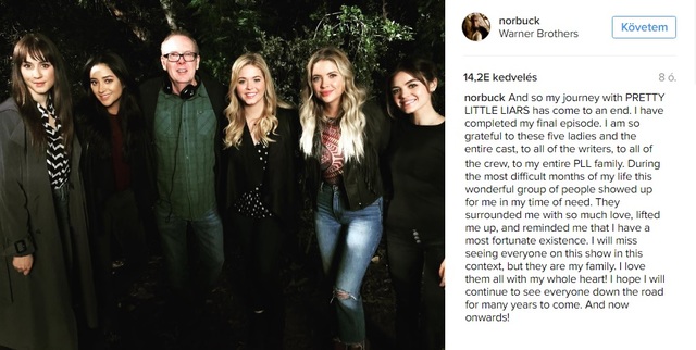 hirdetésNorman ideje lejárt. Szeptember 29-én forgatta le az utolsó epizódját a Pretty Little Liars szereplőivel. Szívszorító közös fotóval mondott búcsút mindenkinek. Megköszönte, hogy egy ilyen csodás csapat része lehetett és hogy a nehéz napjain felvidították őt, és reméli, hogy a jövőben is találkozni fog velük.