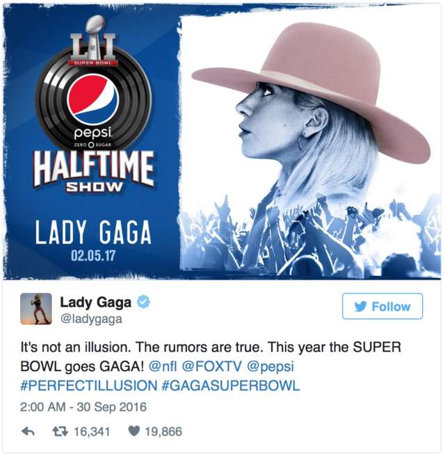 hirdetésKaty Perryt követi most Lady Gaga, aki egészen biztosan egy elképesztő show-t fog csinálni 2017. február 5-én az 51. Super Bowlon. Már egy ideje pletykálják, hogy a Ladyre esett a választás, azonban most ezt hivatalosan is megerősítették.