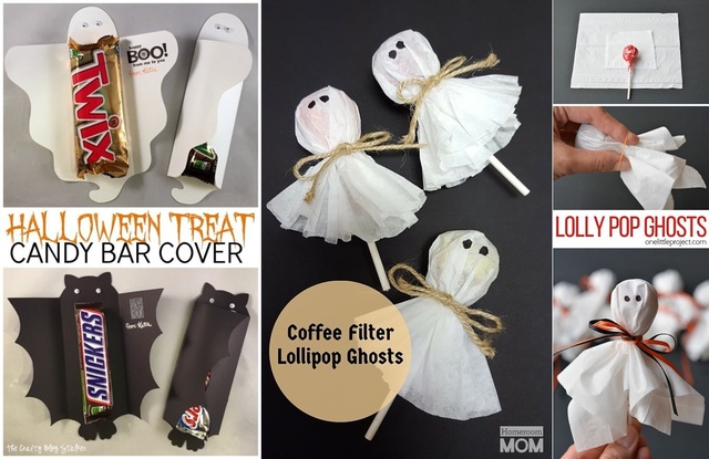 Ha amerikai mintára lidércjárást szerveztek, az alábbi ötletekkel új köntösbe bújtathatjátok az ajándékba szánt édességet. Ebben az esetben csokira és kartonpapírra, valmint méteráru boltban kapható szemre és egy kis kézügyességre lesz szükséged. Készítsd el a papírból az általad választott, alább látható egyszerű, könnyen kivágható formákat (szellem, deenvér) és tégy bele egy csokit (akár oda is erősítheted) és el is készültél.