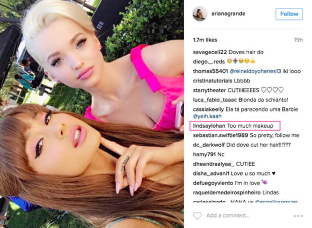 hirdetésAriana Grande tegnap tette közzé az Instagramon a lent látható képet, melyen Hairspray Live!-beli kolléganője, Dove Cameron oldalán pózol. A felvételt közel kétmillió szívecskével jutalmazták az Arianatorok, Lindsay Lohannek azonban nem nyerte el tetszését, aminek hangot is adott egy hozzászólás formájában.