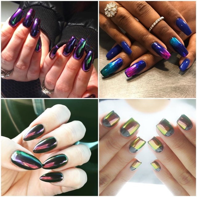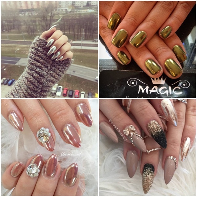 A fémes, tükörszerű csillogás újra divatba jött, amit a hölgyek előszeretettel viseltek önmagában is, míg mások csak díszítőelemként operáltak vele egy-egy körmön.
