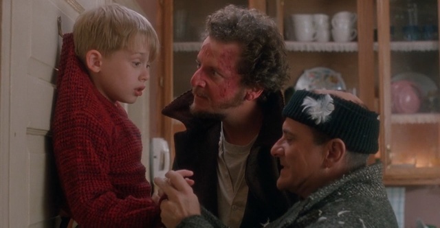 A film utolsó harmadában van az a jelenet, amikor Marv és Harry elkapja Kevint és utóbbi megharapja a gyereket. Amikor a jelenetet próbálták, Pesci valóban megharapta Culkin ujját, ezzel pedig a mai napig meglévő sebet ejtett fiatal kollégáján.